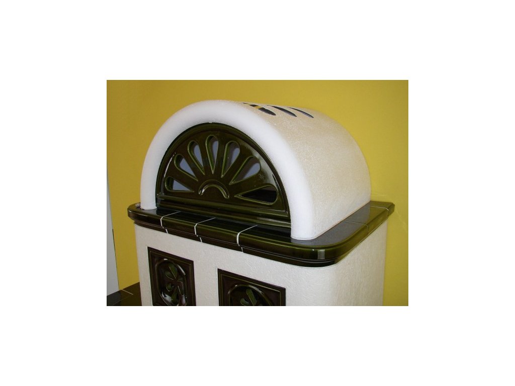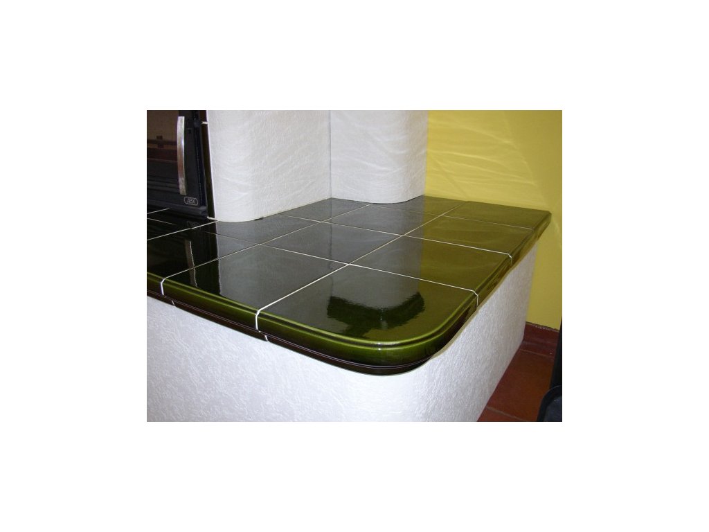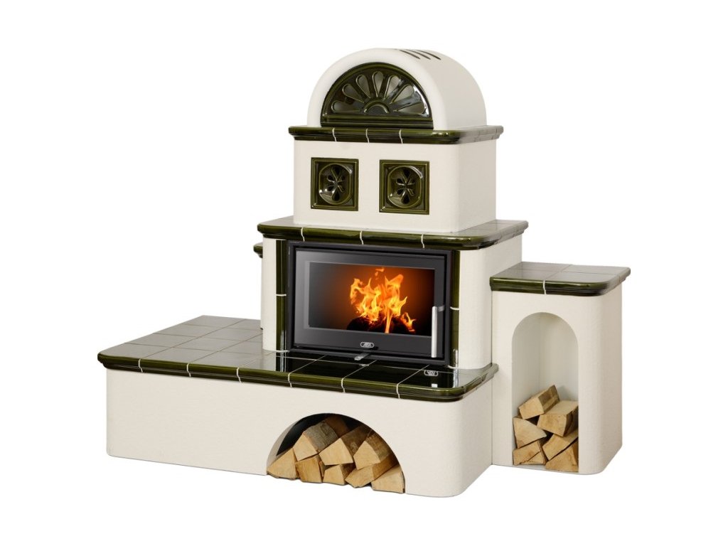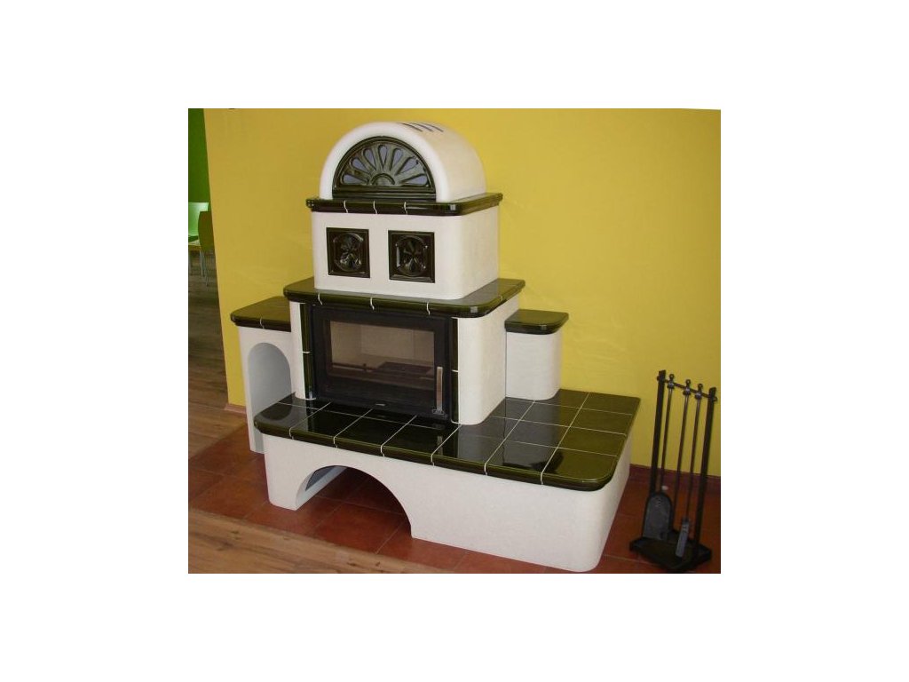 ABX Pegas, kachlová pec, pravé prevedenie čierna/zelená, biely rovný sokel s lavičkou a rímsami