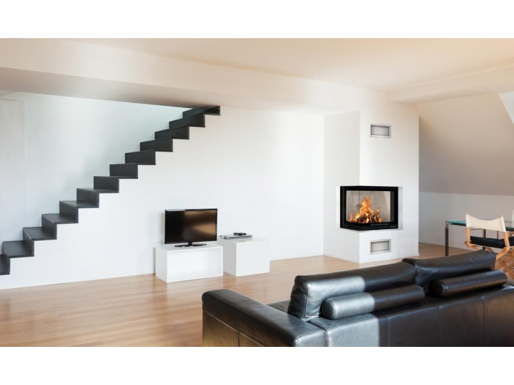 Rohové presklenie s jednodielnym ohýbaným sklom bez rámu v rohu pôsobí moderne a vytvára elegantný pohľad do ohňa z dvoch strán.