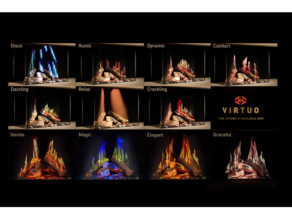 Nezáleží na tom, z ktorej strany sledujete DRU Virtuo – vďaka inovatívnej projekčnej technológii dvier si môžete vychutnať pohľad na skutočný oheň. Nájsť rozdiel je takmer nemožné, pretože pre nás žiaden neexistuje. S Virtuo si môžete vybrať z mnohých štýlov plameňov, aby ste našli ten, ktorý vám najviac vyhovuje a navodil tú správnu atmosféru.