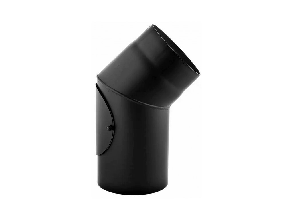 Čierne pevné 45° koleno s revíznym otvorom z oceľového plechu hrúbky 2 mm s priemerom ∅150mm na napojenie krbu a kachlí do komína.