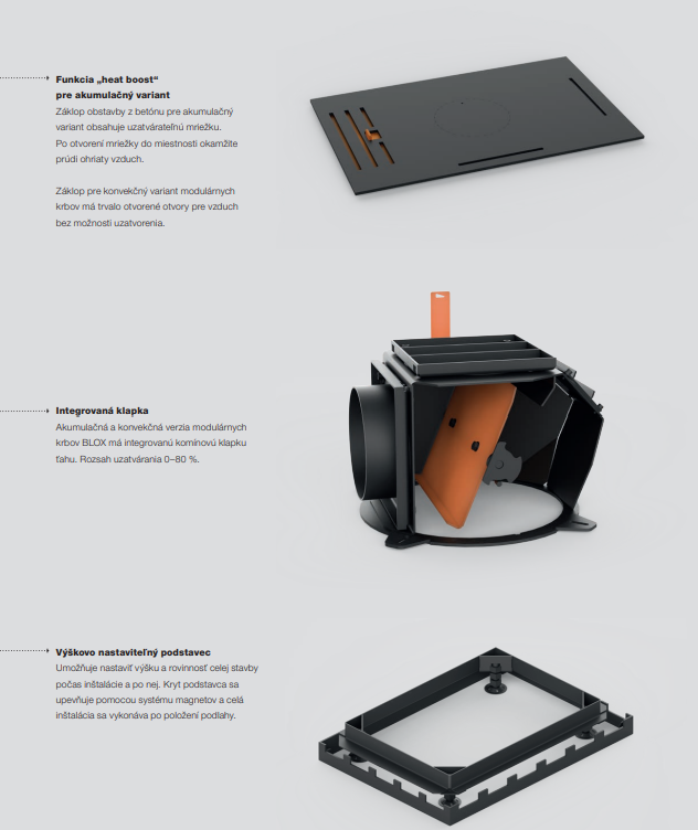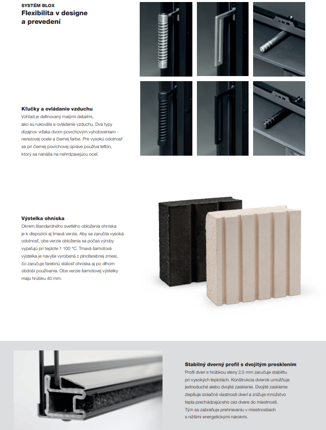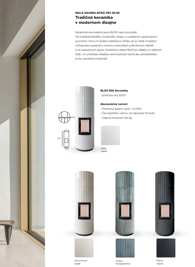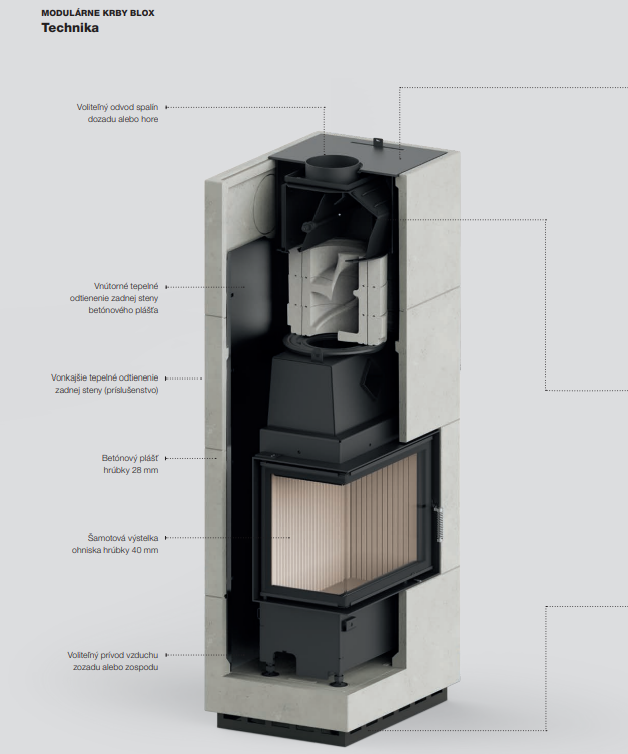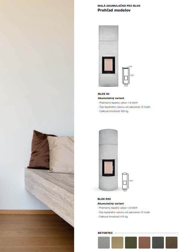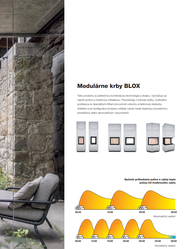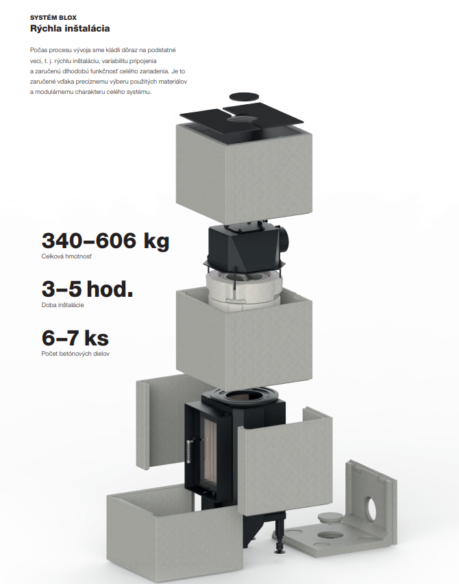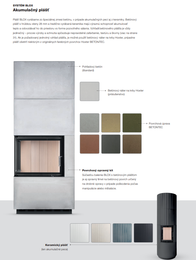 Spolu s rastom kvality technológie budov sa menia aj požiadavky na ich vykurovanie. Kvalitne izolované domy si vyžadujú zmenu prístupu. V porovnaní k masívnemu vykurovaciemu výkonu, ktorý sa rýchlo vyčerpá a vyžaduje časté prikladanie, prichádzajú malé kompaktné akumulačné pece BLOX s odlišnou filozofiou. Ohraničujú tepelný výkon a cielia na dokonalejšiu akumuláciu s nižšou frekvenciou prikladania paliva. Plášť akumulačnej kompaktnej pece BLOX je vyskladaný z modulových segmentov vyhotovených z pohľadového kachliarskeho betónu, ktorý má výborné akumulačno sálavé vlastnosti. Vďaka tomu akumulačná pec BLOX vyžaruje teplo skutočne dlhý čas aj po vyhasnutí ohňa. Jednoduchá a nadčasová obstavba poskytuje nerušený pohľad na čisto horiaci oheň. Veľký dôraz výrobca Hoxter kladie aj na prevedené detaily a nekomplikovanú rýchlu montáž pece. Môžeme skonštatovať, že dizajn a funkčnosť malej akumulačnej pece BLOX sú spojením symbiózy jednoduchého tvaru a kvalitného kachliarskeho remesla.