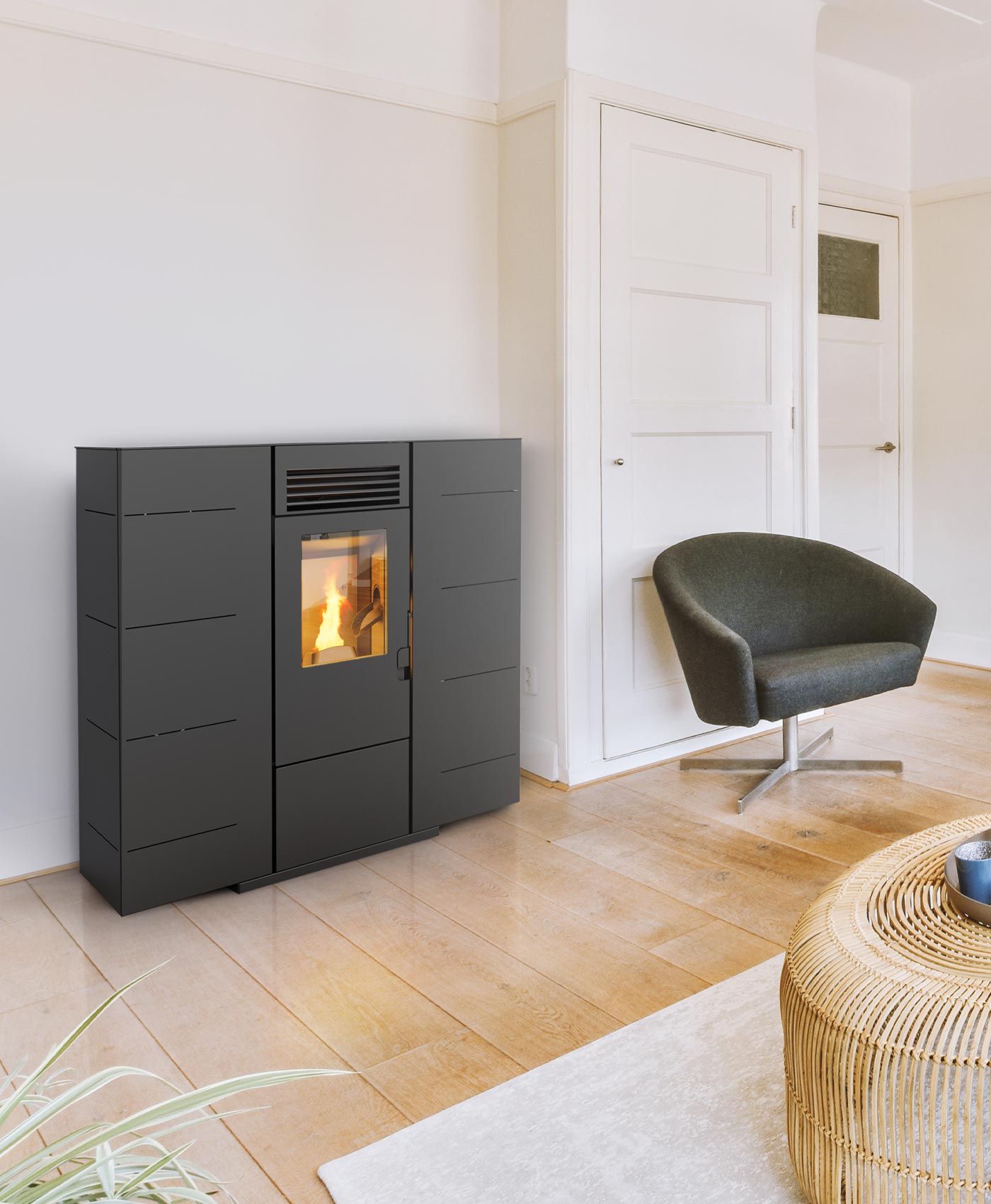 Model Quadra 6 ponúka možnosť bezdrôtového diaľkového ovládania, vďaka čomu je regulácia teploty jednoduchá a pohodlná. Veľká kapacita zásobníka umožňuje dlhú autonómiu kúrenia bez častého dopĺňania paliva.