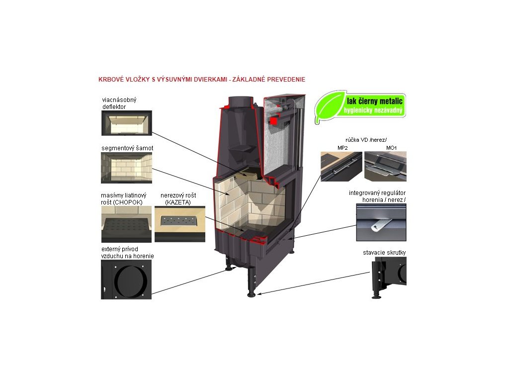 Krbové vložky sú pružným zvarencom zo žiaruvzdorného oceľového plechu, chráneného tepelne odolným ekologickým lakom. Konštrukcia je celopieskovaná, vhodne doplnená liatinovými a žiaruvzdornými materiálmi (šamot, žiarobetón), ktoré zabezpečujú tepelnú zotrvačnosť a vysokú životnosť. Dvierka presklené žiaruvzdorným keramickým sklom umožňujú pohľad na plameň v prehĺbenom ohnisku, bezpečnú a hospodárnu prevádzku.