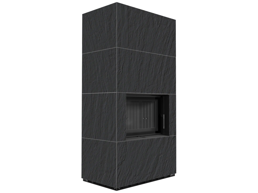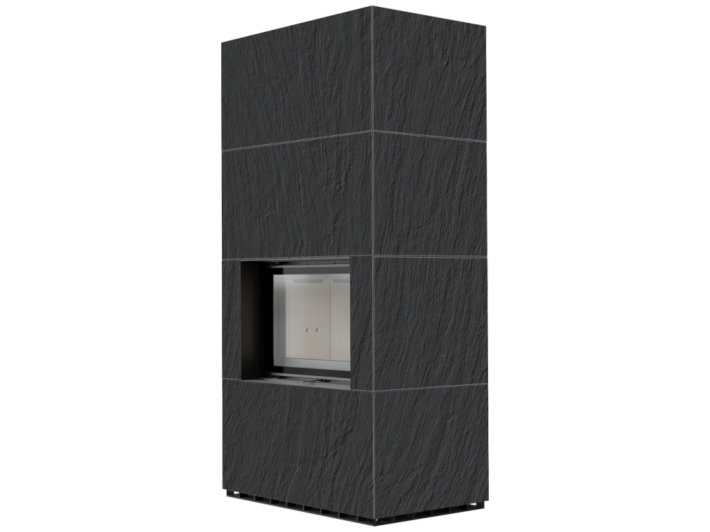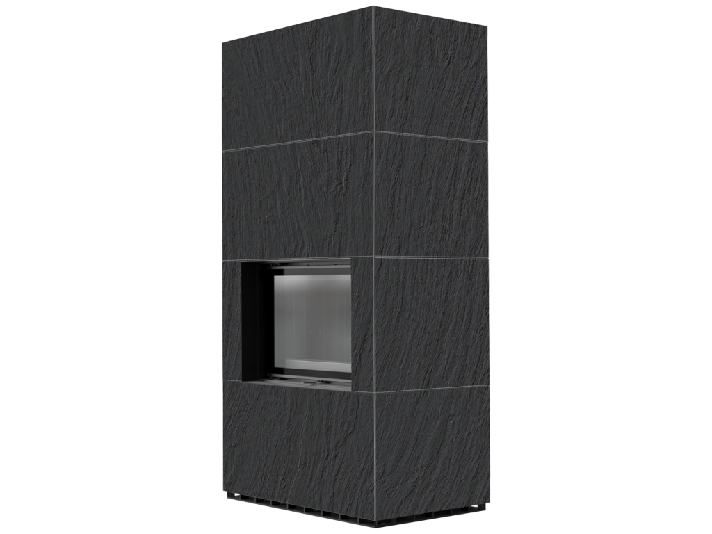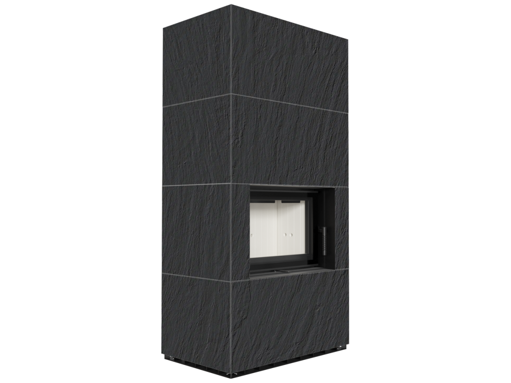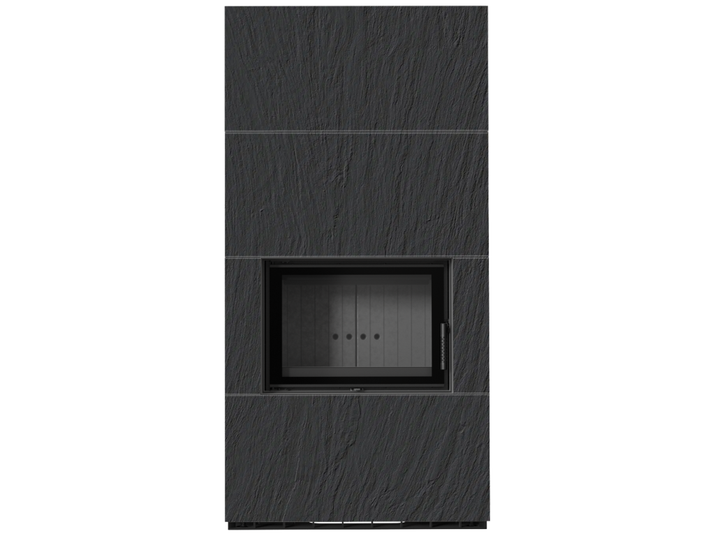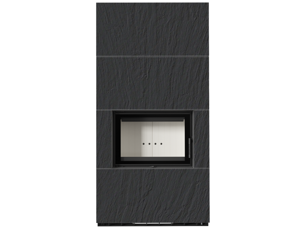 Kratki FLOKI 8 Box oceľová krbová vložka, kamenné opláštenie ARDESIA NERO A SPACCO, rovné presklenie, ohnisko termotec