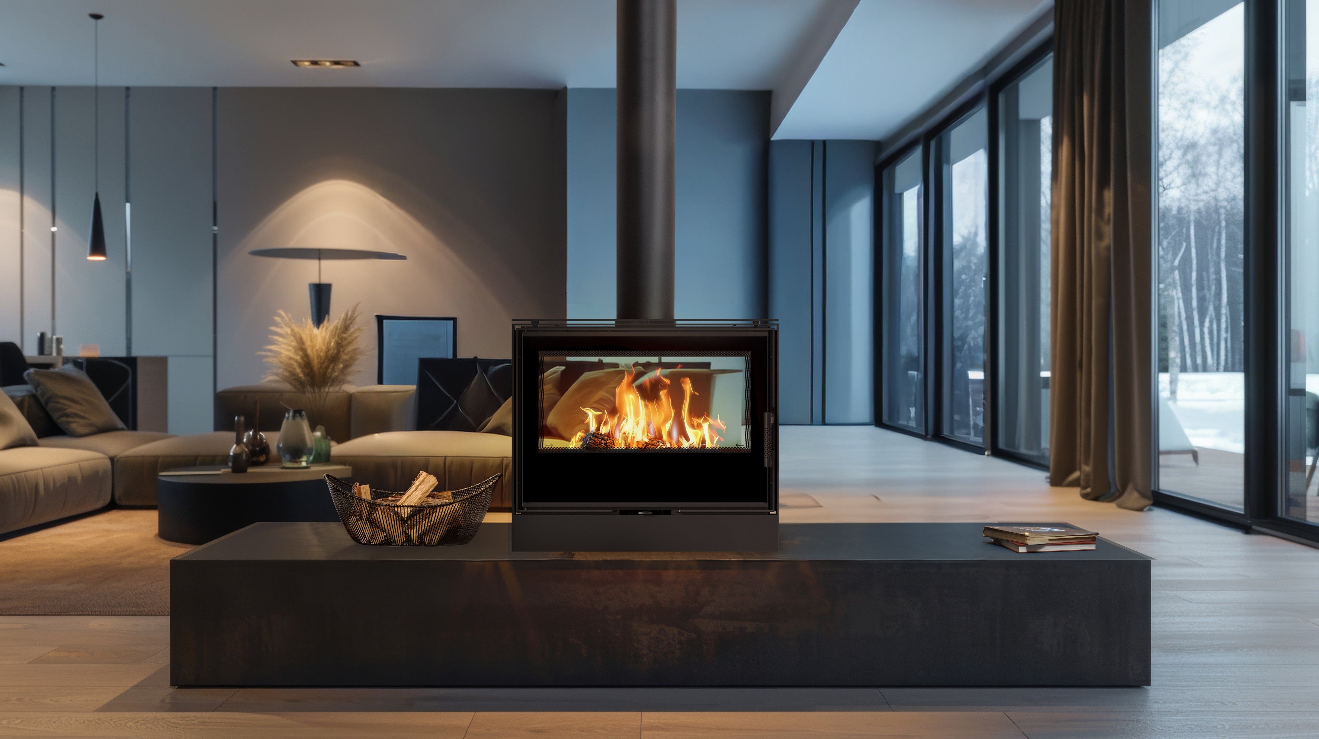 tunelové presklenie umožňuje pohľad na oheň z dvoch miestností,