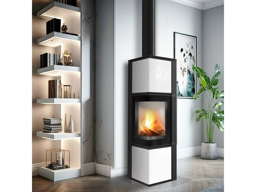 - moderné krbové kachle na drevo s bielymi sklenenými panelmi