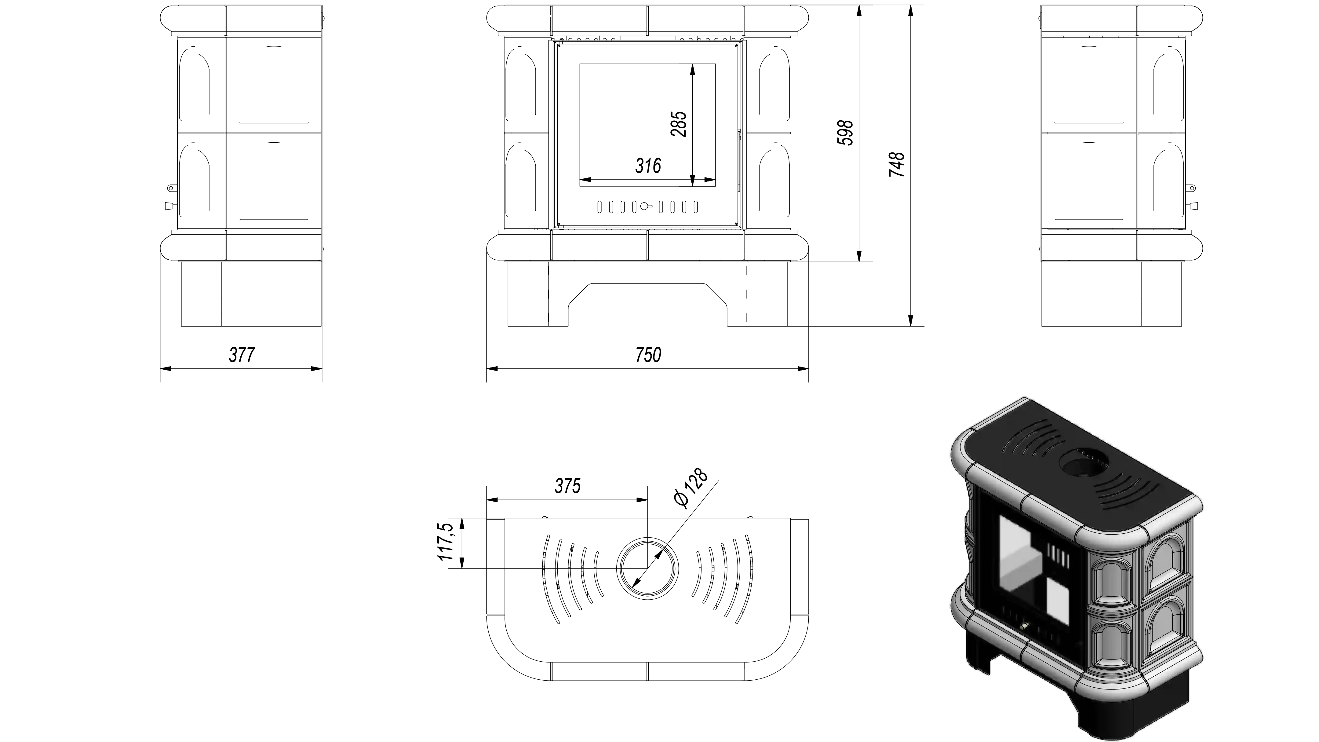Kratki WK 440 oceľ čierna, keramika čierna, ohnisko Termotec