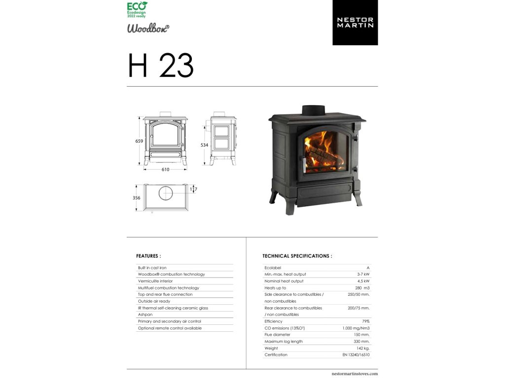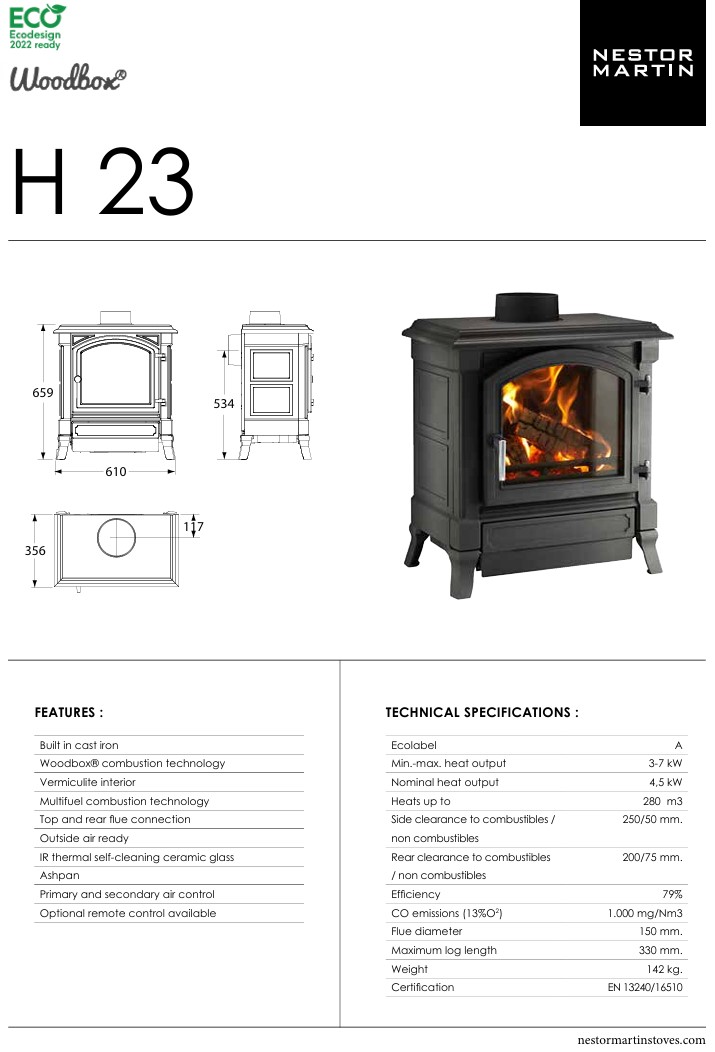 Model Nestor Martin H23 patrí medzi menšie kachle z kolekcie H Series a je ideálnou voľbou pre vykurovanie stredne veľkých miestností. Spája tradičný rustikálny vzhľad liatinových kachlí s modernou technológiou WOODBOX®, ktorá zabezpečuje vysokú účinnosť spaľovania a minimálny dopad na životné prostredie.