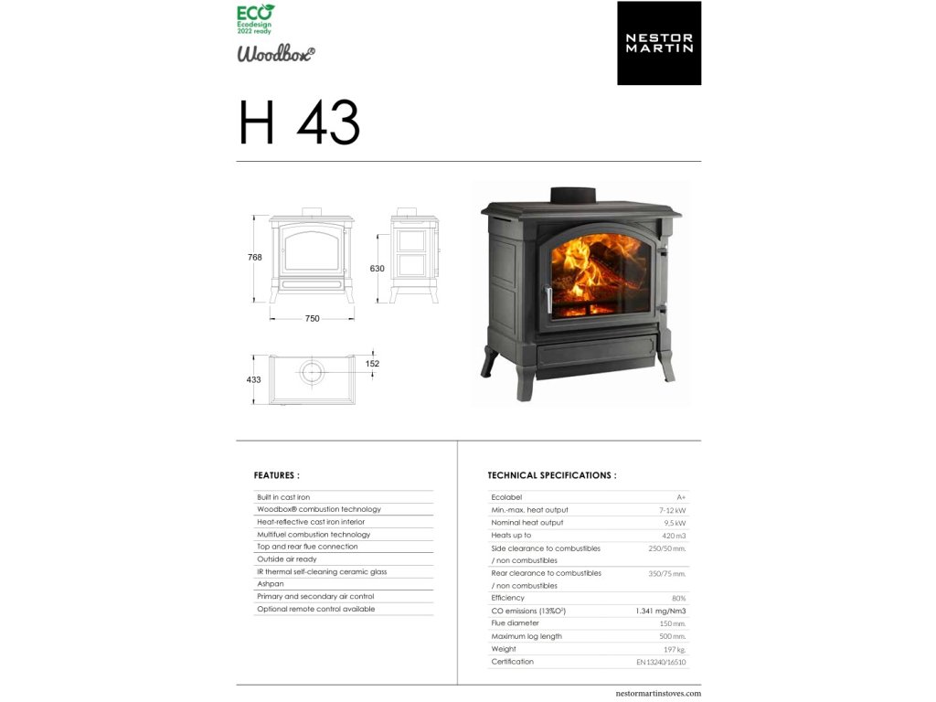 Model Nestor Martin H43 je najväčší z kolekcie H Series a so svojím výkonom 10,5 kW dokáže spoľahlivo vykúriť aj priestranné miestnosti počas najchladnejších dní. Rustikálny vzhľad liatinových kachlí dopĺňa moderná technológia WOODBOX®, ktorá zaručuje efektívne spaľovanie s minimálnym dopadom na životné prostredie.