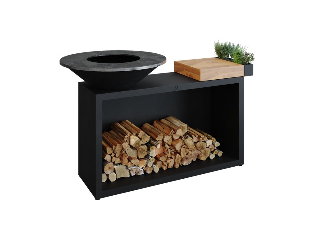 OFYR Black Wood Island OIB-85-TW spája prémiový dizajn, špičkovú funkcionalitu a kompaktné rozmery do jednej plnohodnotnej vonkajšej kuchyne. Vyrobený z čiernej lakovanej ocele, ponúka úložný priestor na drevo, masívnu krájaciu dosku z gumovníkového dreva a praktickú poličku na príbor či koreniny.