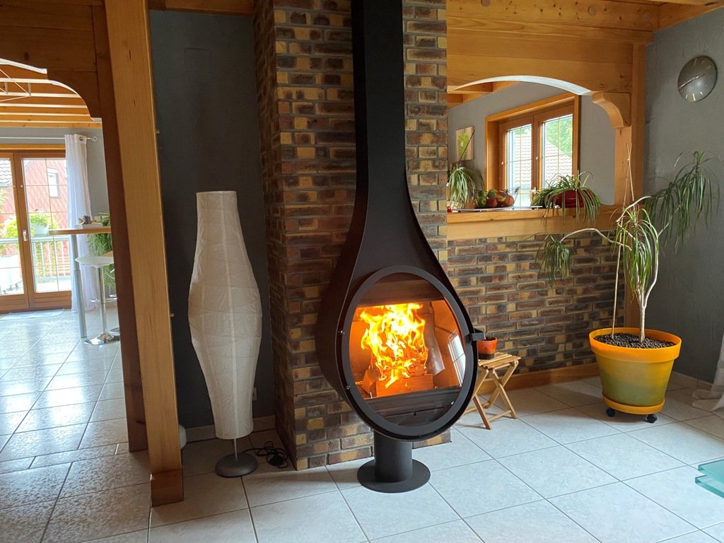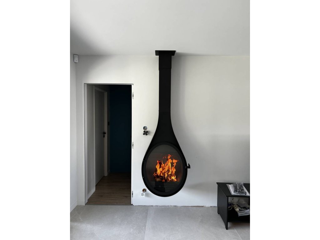 Unikátny dizajn – Závesný krb v tvare kvapky dodáva interiéru eleganciu a originalitu.