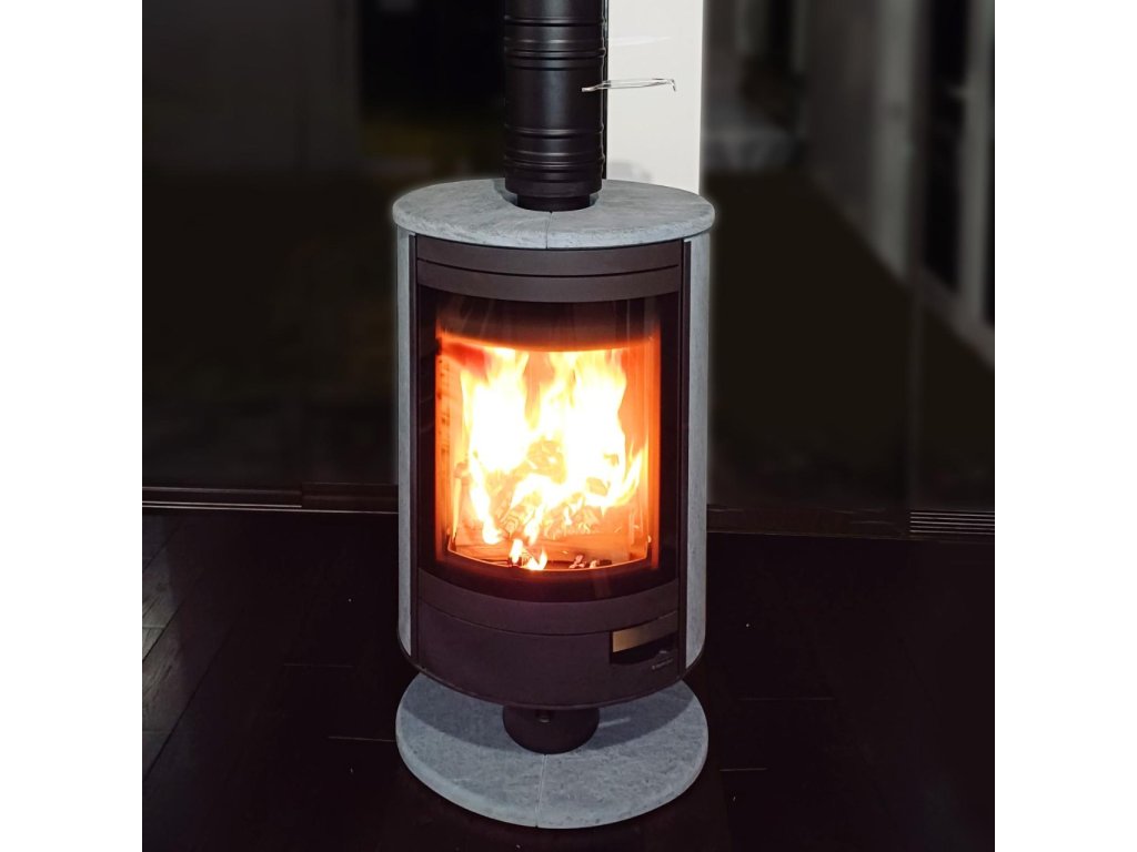 ✔ Obklad z prírodného kameňa – Bočné panely sú vyrobené z kvalitného prírodného kameňa v zelenošedom odtieni, ktorý nielenže dodáva kachliam luxusný vzhľad, ale zároveň zvyšuje ich akumulačné vlastnosti. Kameň dokáže absorbovať teplo a postupne ho uvoľňovať, čím zabezpečuje príjemné sálavé teplo aj po dohorení dreva.