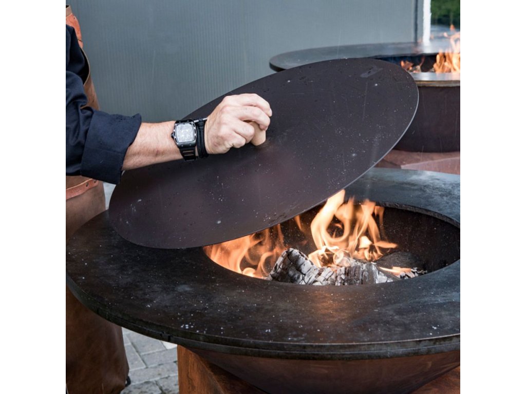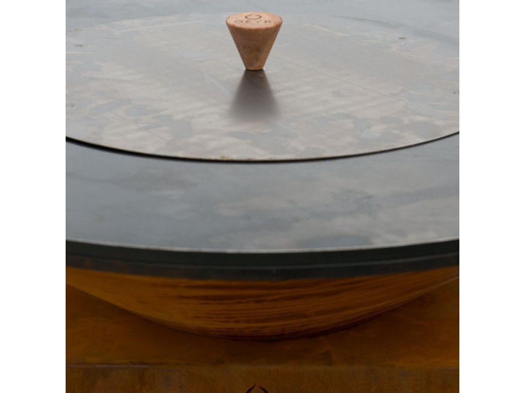 Pre bezpečné udusenie ohňa po skončení grilovania na OFYRe použite našu pokrievku Snuffer Black 85, 100 alebo XL vyrobenú z čiernej práškovanej ocele s mahagónovým madlom. Pokrievka má na sebe 6 výstupkov, ktoré zabraňujú jej posunutiu pri vyhasínaní ohňa.