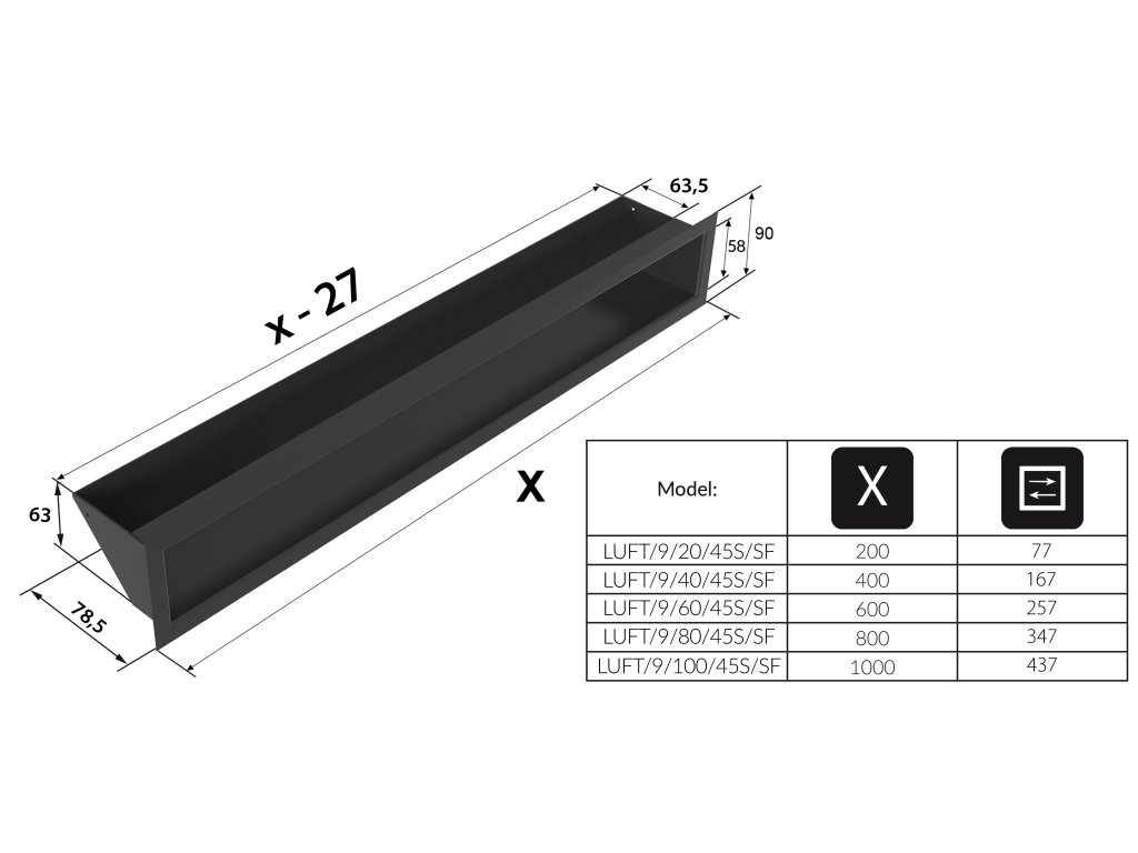 Krbová mriežka LUFT 45S SF je určená na montáž do krbových obstavieb, kde slúži ako estetické zakončenie otvorov na prúdenie vzduchu v krbe. Jej dizajn ju predurčuje na použitie v moderných interiéroch. Charakteristickým prvkom modelu LUFT 45S SF je skrytý otvor, ktorý umožňuje optimálne prúdenie vzduchu bez priameho pohľadu do vnútra krbovej obstavby. Pri montáži je však dôležité správne orientovať mriežku: ak ju umiestňujete nad krbovou vložkou na výdaj teplého vzduchu, otvor by mal smerovať nadol; ak ju montujete pod krbovú vložku na príjem chladného vzduchu, otvor by mal smerovať nahor. Nezabudnite tiež na minimálnu požadovanú veľkosť mriežok v závislosti od výkonu krbovej vložky. Mriežky sú povrchovo upravené práškovým lakovaním, vďaka čomu sú odolné voči vysokým teplotám a mechanickému poškodeniu. Záruka na výrobok je 24 mesiacov.